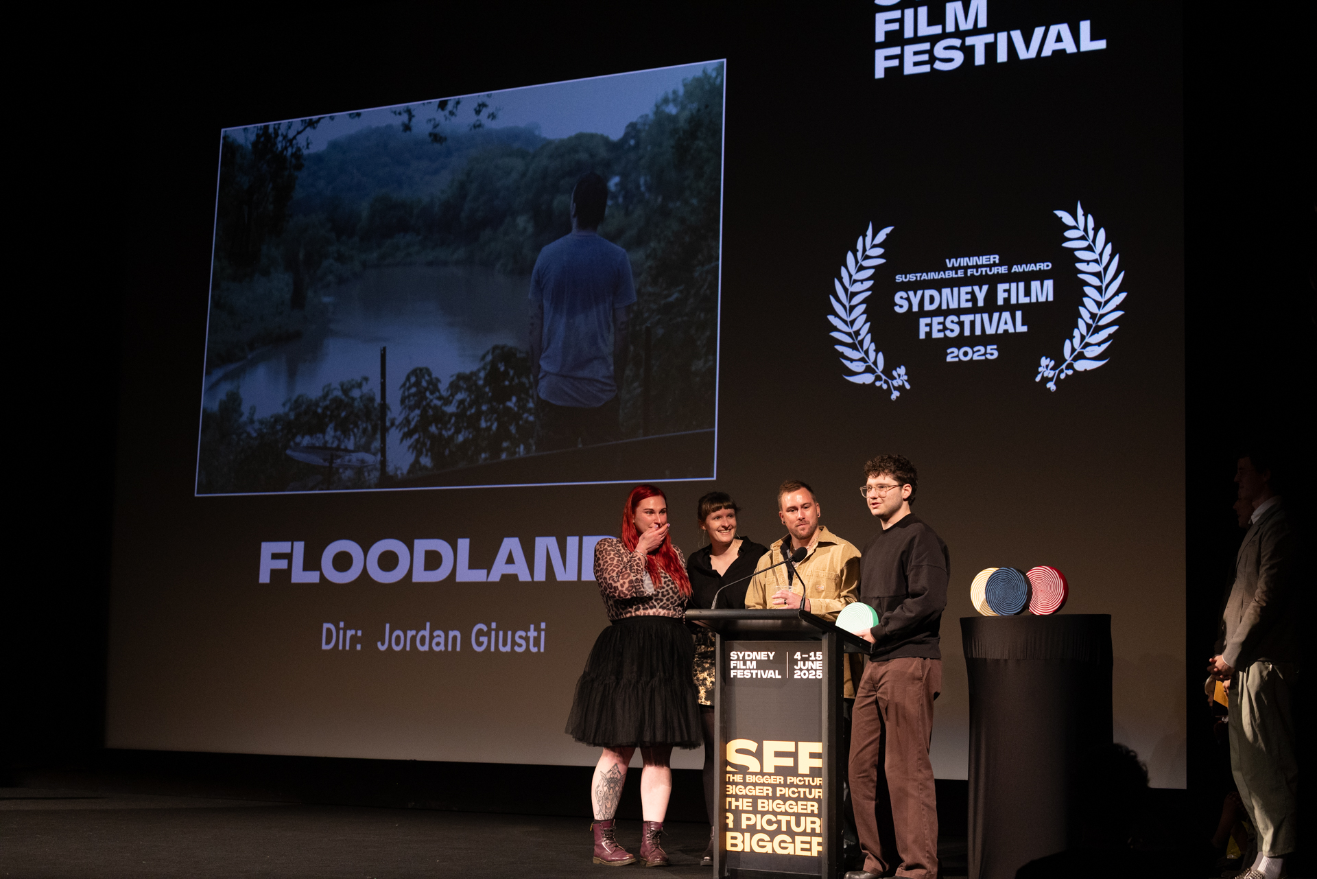 The team behind Floodland receiving the Sustainable Future Award at the Closing Night of Sydney Film Festival 2025